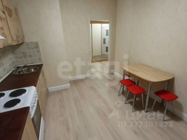 На полу в комнате и в коридоре - ламинат, на кухне - керамогранит. Натяжные потолки с точечным светом. На кухне полы с подогревом.