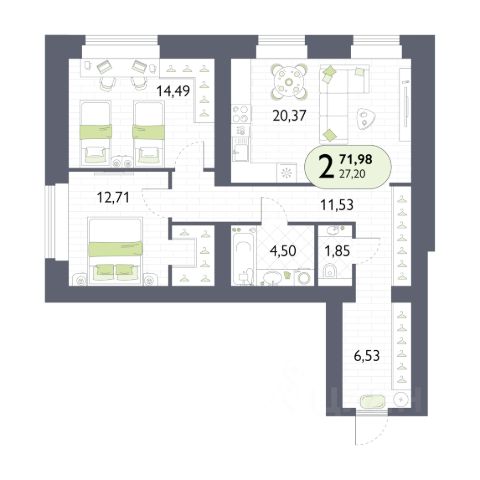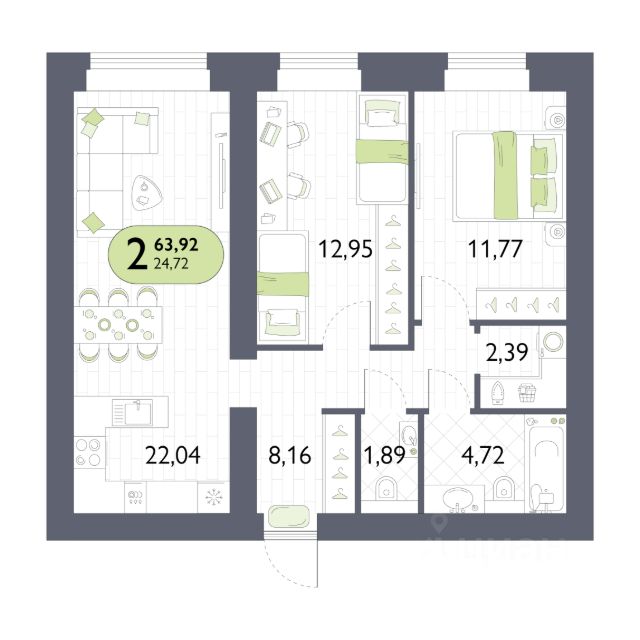 Функциональные планировки (Большая кухня-гостиная и отдельные спальни);