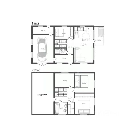 1й этаж: просторный холл - прихожая, кухня-столовая площадью 40 м² - идеальная для семейных ужинов и душевных посиделок с выходом на веранду, две просторные спальни (25 кв.м. и 15 кв.м), из одной выход в теплый гараж, санузел с душевой, ванной и туалетом. Два крыльца, обеспечивающих комфортный вход с обеих сторон дома.