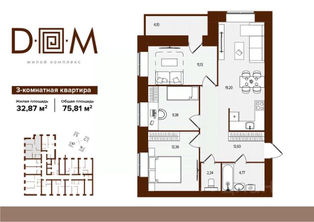 Продаётся 3-комнатная квартира в строящемся доме (поз.1), срок сдачи: IV-кв. 2027, общей площадью 75.81 кв.м., на 2 этаже. Новый жилой комплекс "Д.О.М." от застройщика "Надежда" расположен по адресу: г. Брянск, ул. Романа Брянского