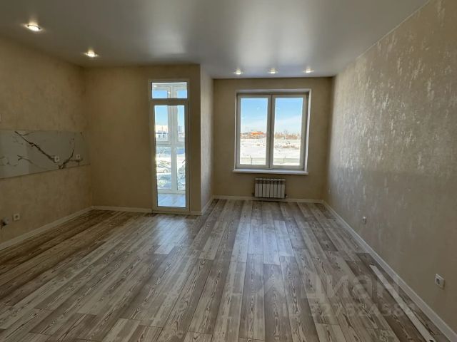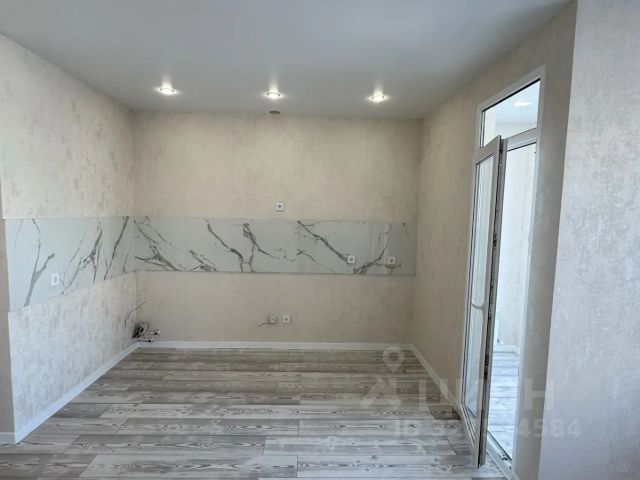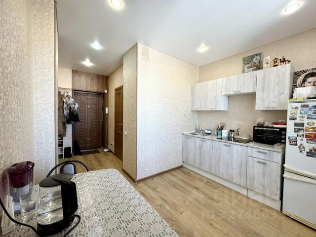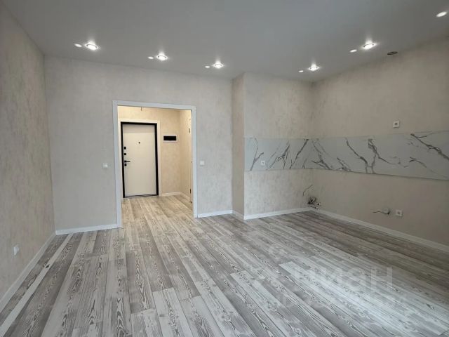 На полу в комнате и в коридоре - ламинат, на кухне - керамогранит. Натяжные потолки с точечным светом. На кухне полы с подогревом.