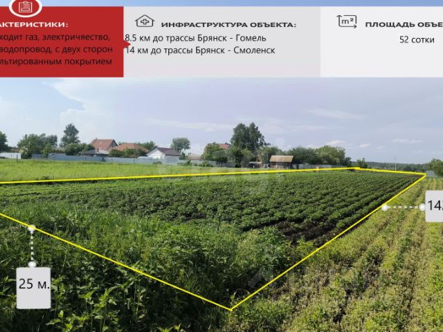 ЗВОНИТЕ ПОЖАЛУЙСТА, сообщения не приходят! Земельный участок 52 сотки в д. Трубчино Добруньского сельского поселения. Участок ровный прямоугольной формы, земля разработана, посажен картофель. С двух сторон от участка выезд на твердую дорогу, вдоль участка газ, вода, электричество. Рядом магазин. По улице жилые дома, где круглогодично проживают соседи. Хорошая асфальтированная дорога до основных магистралей А-240 Гомель и Р-120 Смоленск. Рядом живописная природа и отсутствие городской суеты. Межевание сделано. Оперативный просмотр и юридическая чистота сделки. Звоните отвечу на все интересующие вопросы. Код пользователя: 179275 Номер в базе: 8527039