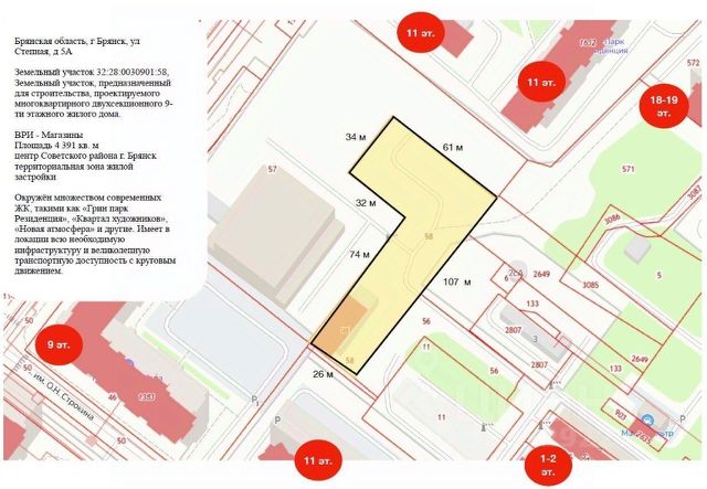 Земельный участок для строительства жилого многоквартирного дома, площадью 4391 кв.м расположен в центре Советского района г. Брянска, в территориальной зоне жилой застройки. Окружён множеством современных ЖК, такими как "Грин парк Резиденция", "Квартал художников", "Новая атмосфера" и другие. Имеет в локации всю необходимую инфраструктуру и великолепную транспортную доступность с круговым движением.