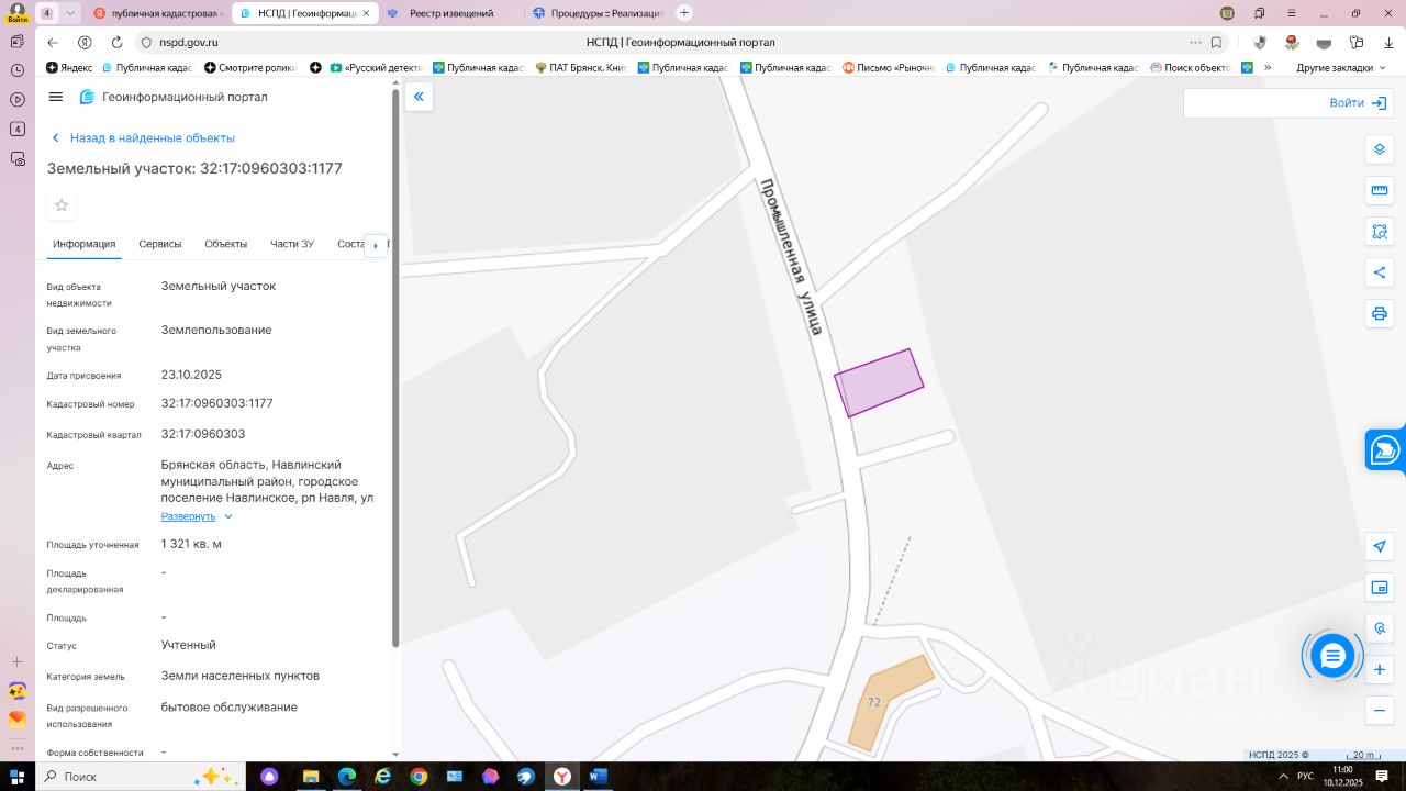 право аренды сроком на 5 лет на земельный участок из земель населенных пунктов с кадастровым номером 32:17:0960303:1177, местоположение: Брянская область, Навлинский район, Навлинское городское поселение, рп. Навля, улица Промышленная площадью 1321 кв.м., разрешенное использование: бытовое обслуживание;