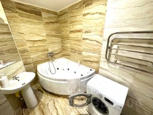 Большая угловая ванна оснащена джакузи.