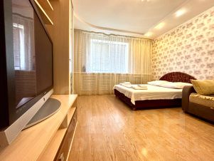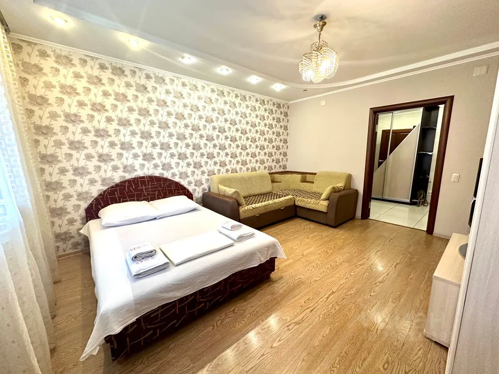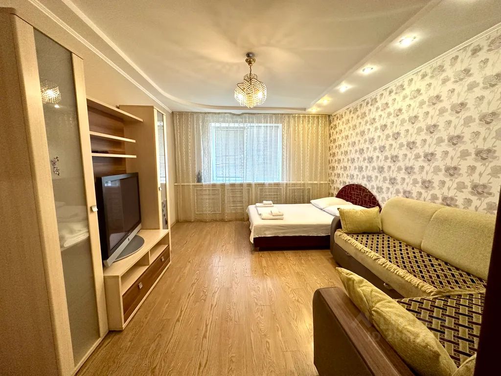 Описание квартиры от "Flats-line" в Брянске по ул. Красноармейская, 100. Однокомнатная квартира с хорошим стандартным ремонтом на 6 этаже с видом на центр города, установлена кухня с набором посуды, необходимой техникой. Спальные места: 2+2 (двуспальная кровать и двуспальный раскладной диван).