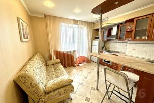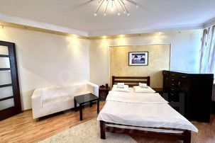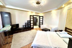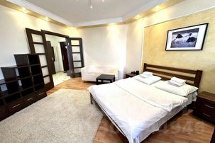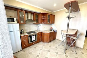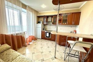 Однокомнатная квартира с современным ремонтом на 14 этаже с видом на центр города, установлена кухня с набором посуды, встроенной техникой. СПАЛЬНЫЕ МЕСТА: 2+2. Комната укомплектована современной мебелью: ЖК телевизор. Санузел раздельный, на кухне дополнительное спальное место раскладной диван, всегда горячая вода, фен, стиральная машинка, балкон.