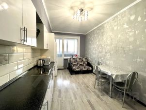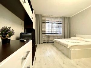 Однокомнатная квартира с современным ремонтом на 7 этаже, установлена кухня с набором посуды, встроенной техникой. Спальные места: 2+2+1 (двуспальная кровать, двуспальный раскладной диван, одноместный диван расположен на кухне). Окна выходят во двор дома. Лифт.