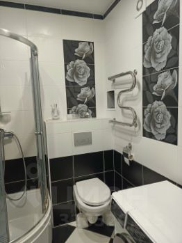 Санузел совмещенный, облицован плиткой, установлена душевая кабина.