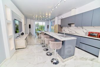 Островная зона в кухне-гостиной дополнена стульями с закругленными спинками — в них можно расслабиться и чувствовать себя максимально комфортно.