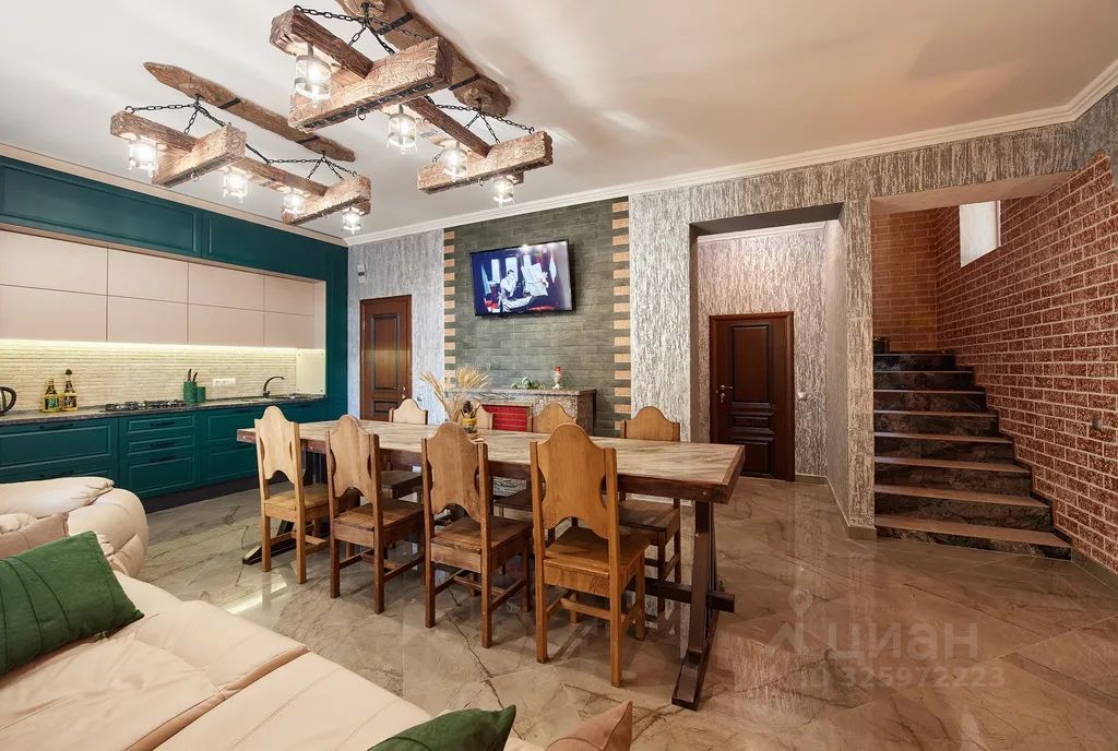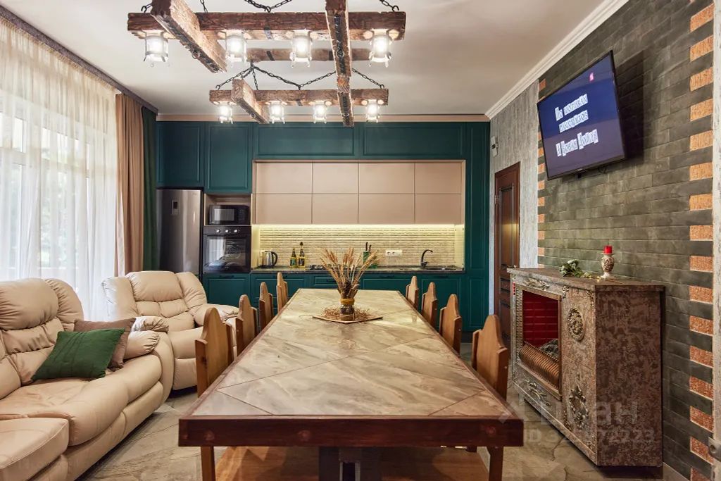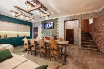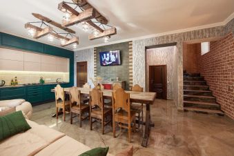 На 1м этаже - каминный зал с современной, оборудованной всем необходимым, кухней. Удобный мягкий кожаный диван с креслом - реклайнером. Большой гостеприимный стол, за которым комфортно могут разместиться 16-18 чел. Wi-fi. Бытовая техника: телевизор, свч, холодильник, духовой шкаф, газовая плита, эл. Чайник. Весь необходимый набор посуды и столовых принадлежностей. 2й этаж - три изолированные спальни с различным размещением (2+1; 2+1; 2), общей вместимостью до 8 чел. Постельные принадлежности, средства личной гигиены.