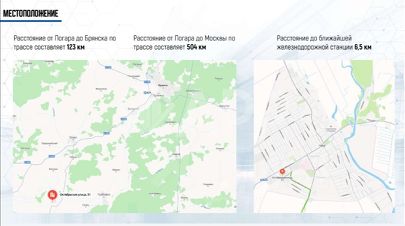 Удобное расположение еще одно неоспоримое достоинство комплекса. Погар находится всего в 123 км от Брянска и в 504 км от Москвы. Отличная автомобильная дорога обеспечивает быструю и комфортную транспортировку грузов и персонала без пробок. Близость к железнодорожной станции (всего 6,5 км) открывает дополнительные возможности для логистики и расширяет географию вашего бизнеса.