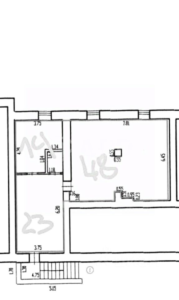 - Состоит из трёх комнат: 14 м² + 48 м² + 23 м²