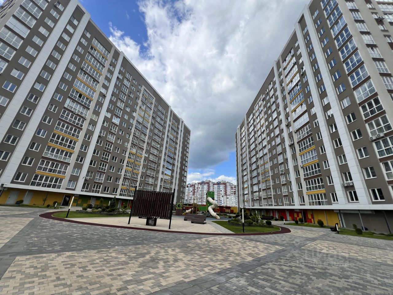 - Благодаря уникальной архитектуре двор располагается выше уровня земли над паркингом между двумя корпусами, а доступ на территорию осуществляется через КПП, что делает его безопасным и защищенным от доступа посторонних людей.
