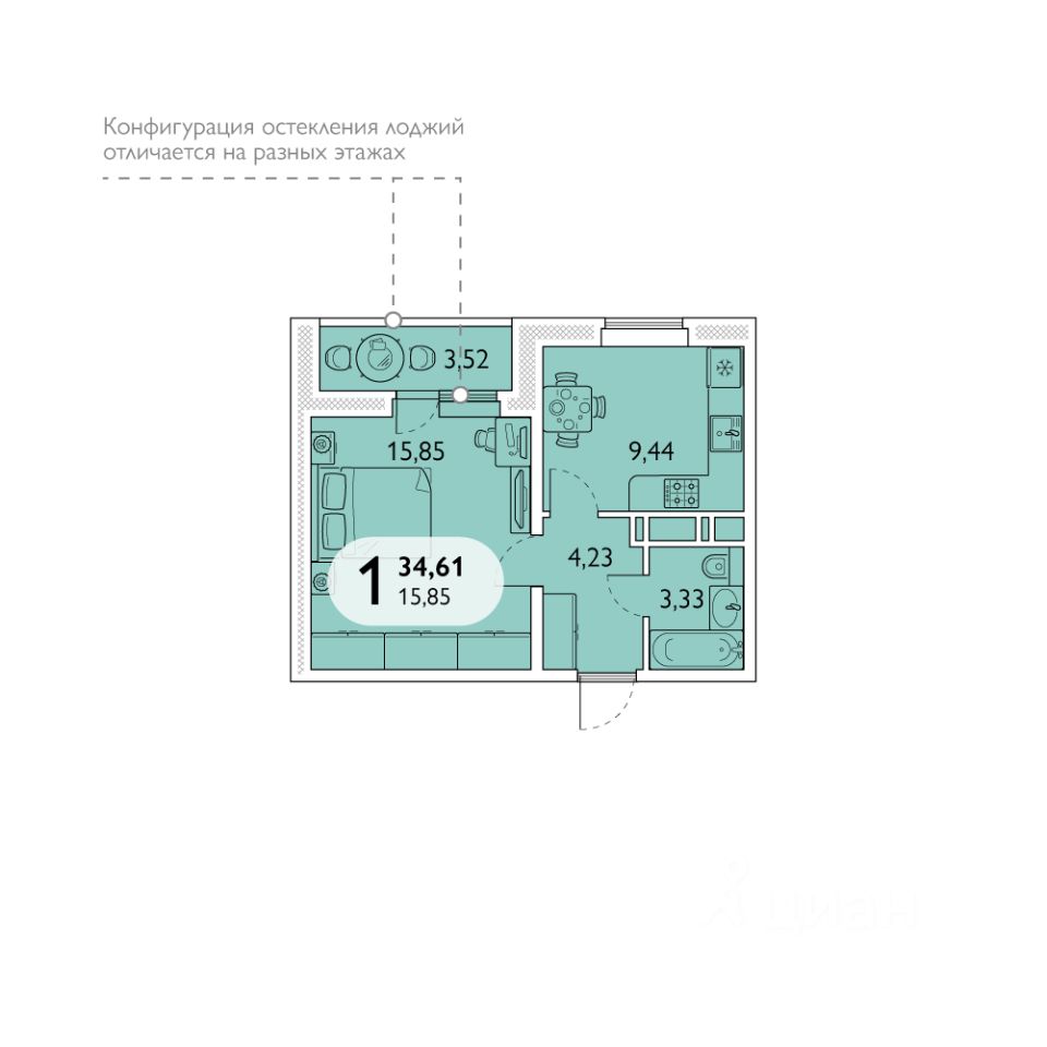 Продаётся 1-комнатная квартира в сданном доме (Поз. 7), срок сдачи: II-кв. 2025, общей площадью 34.61 кв.м., на 7 этаже.
