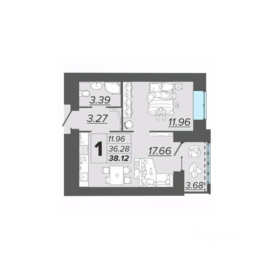Общая площадь38,12 м²