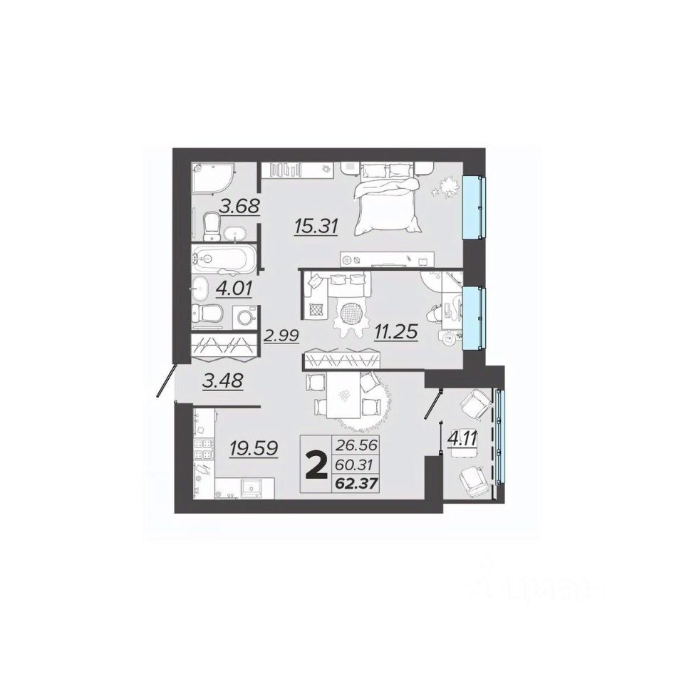 Общая площадь62,37 м²