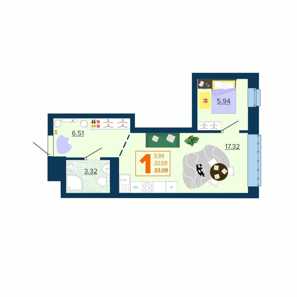 Общая площадь33,09 м²