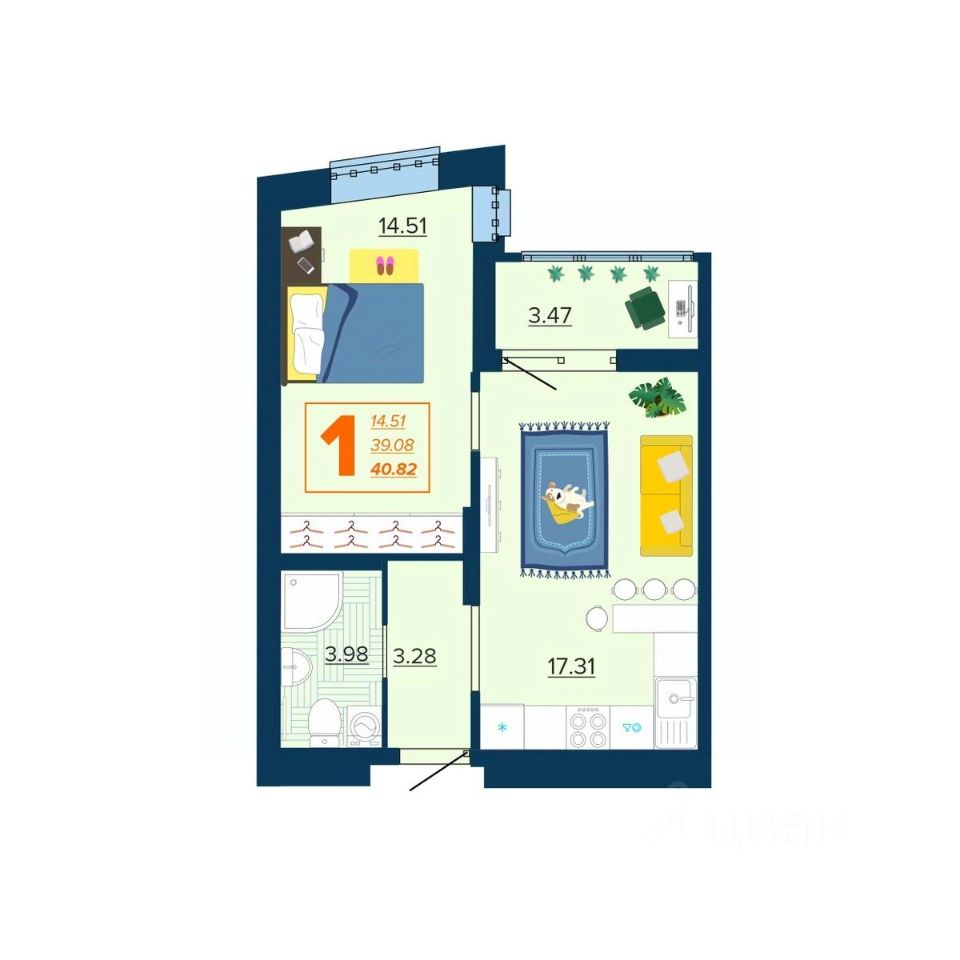 Общая площадь40,82 м²