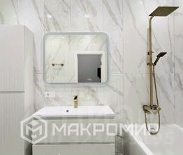 Выполнен с использованием дорогих и качественных материалов. Полы с подогревом и пожизненной гарантией, высококачественный керамогранит, итальянская сантехника.