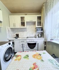 На кухне сделан свежий ремонт, белый кухонный гарнитур вместе с встроенной плитой остается.