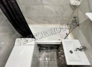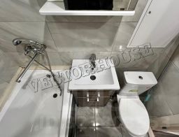 -В квартире выполнен современный ремонт из хороших материалов, в санузле - плитка и кафель с качественной сантехникой, натяжные потолки и точечное освещение с учетом зональностей, в квартире новая электропроводка - материал