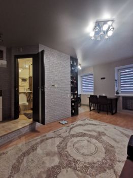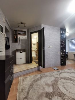 Уютная и светлая квартира с необычной планировкой студийного типа: кухня объединена с гостиной, санузел совмещён, есть отдельная изолированная комната с гардеробной. Во всех комнатах выполнена шумоизоляция стен.