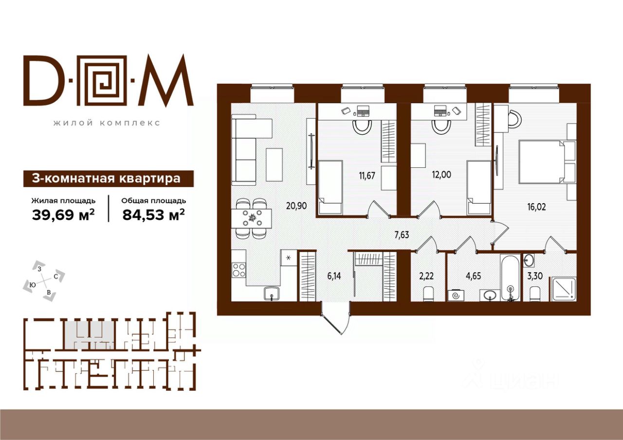 Продаётся 3-комнатная квартира в строящемся доме (поз.1), срок сдачи: IV-кв. 2027, общей площадью 84.53 кв.м., на 2 этаже. Новый жилой комплекс "Д.О.М." от застройщика "Надежда" расположен по адресу: г. Брянск, ул. Романа Брянского