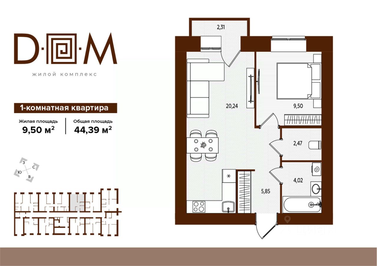 Продаётся 1-комнатная квартира в строящемся доме (поз.1), срок сдачи: IV-кв. 2027, общей площадью 44.39 кв.м., на 3 этаже. Новый жилой комплекс "Д.О.М." от застройщика "Надежда" расположен по адресу: г. Брянск, ул. Романа Брянского