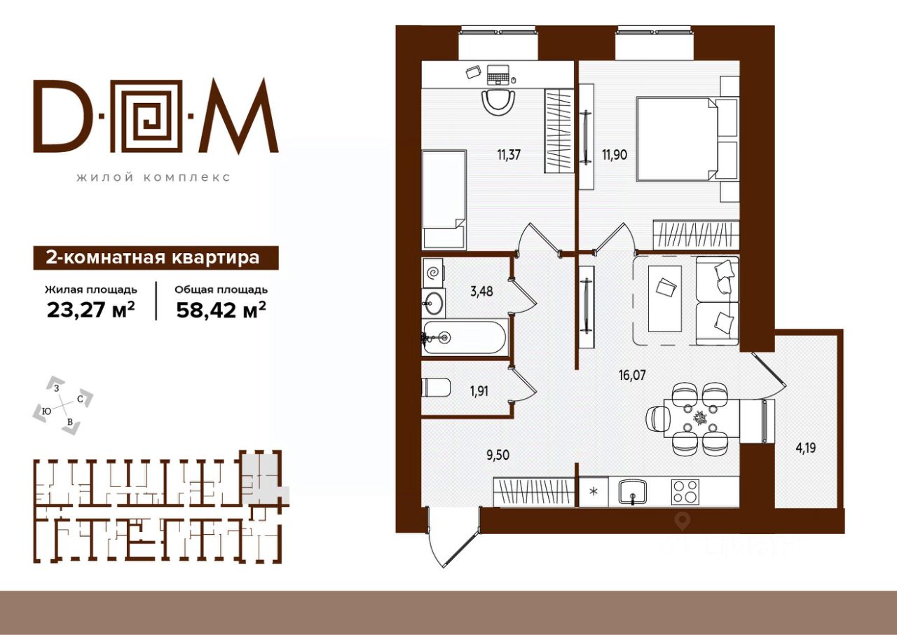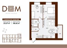 Продаётся 2-комнатная квартира в строящемся доме (поз.1), срок сдачи: IV-кв. 2027, общей площадью 58.42 кв.м., на 5 этаже. Новый жилой комплекс "Д.О.М." от застройщика "Надежда" расположен по адресу: г. Брянск, ул. Романа Брянского