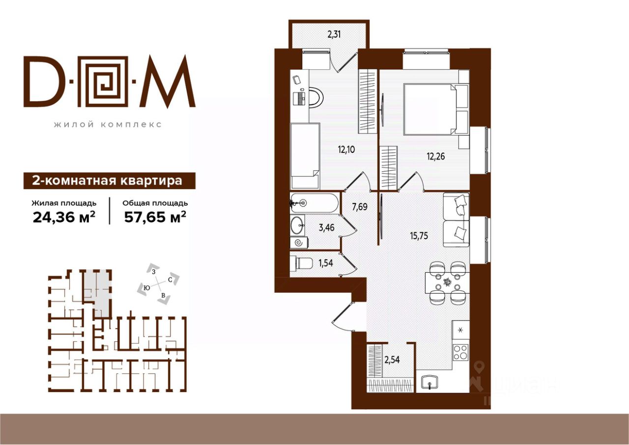 Продаётся 2-комнатная квартира в строящемся доме (поз.1), срок сдачи: IV-кв. 2027, общей площадью 57.65 кв.м., на 8 этаже. Новый жилой комплекс "Д.О.М." от застройщика "Надежда" расположен по адресу: г. Брянск, ул. Романа Брянского