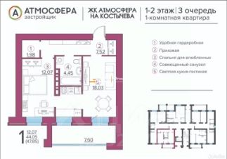 Квартира расположена на 7 этаже 10-этажного дома. Общая площадь 48 кв.м позволяет комфортно разместиться как одному человеку, так и молодой паре.