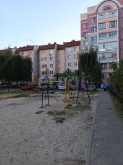 Во дворе современная детская площадка, с качелями, песочницей и лоавочками, и все это утопает в зелени деревье и кустарников. Двор большой, рядом с домом достатоное количество парковочных мест.