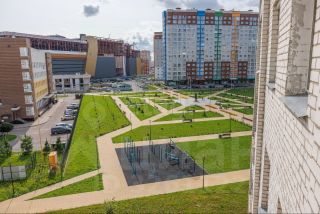 - Ухоженный двор с зелеными насаждениями, лавочками и детской площадкой — идеальное место для отдыха с детьми.
