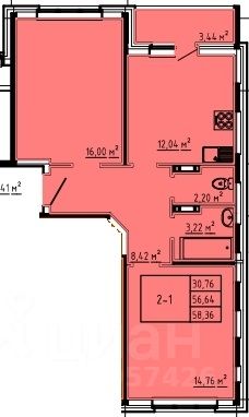 2-комн. квартира, 58,1 м²