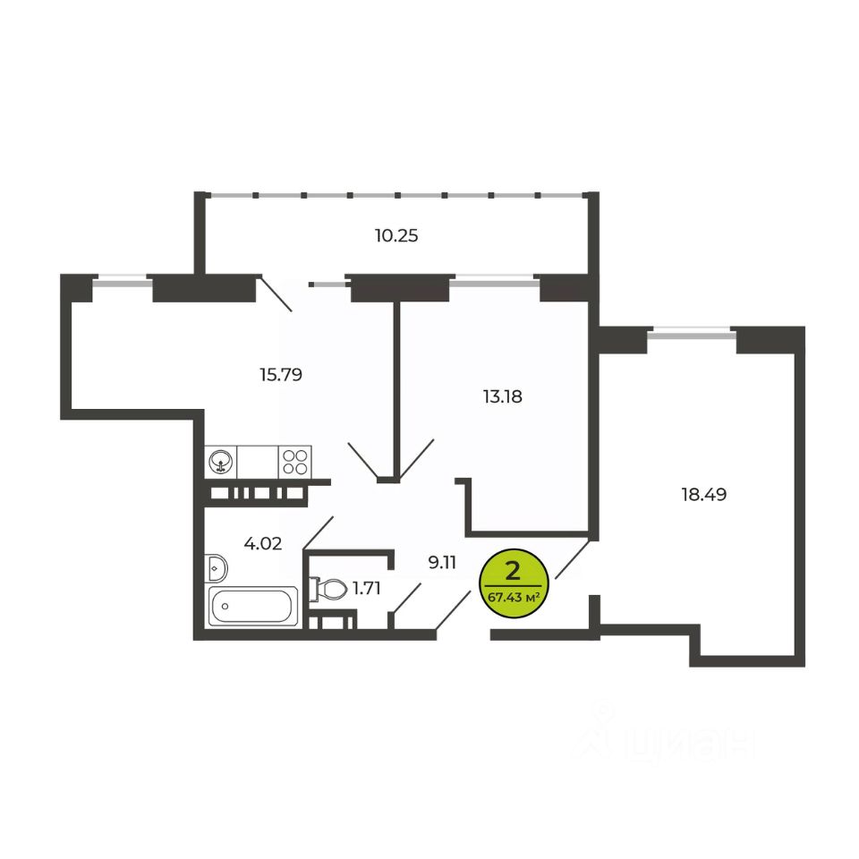 2-комн. квартира, 67,43 м²