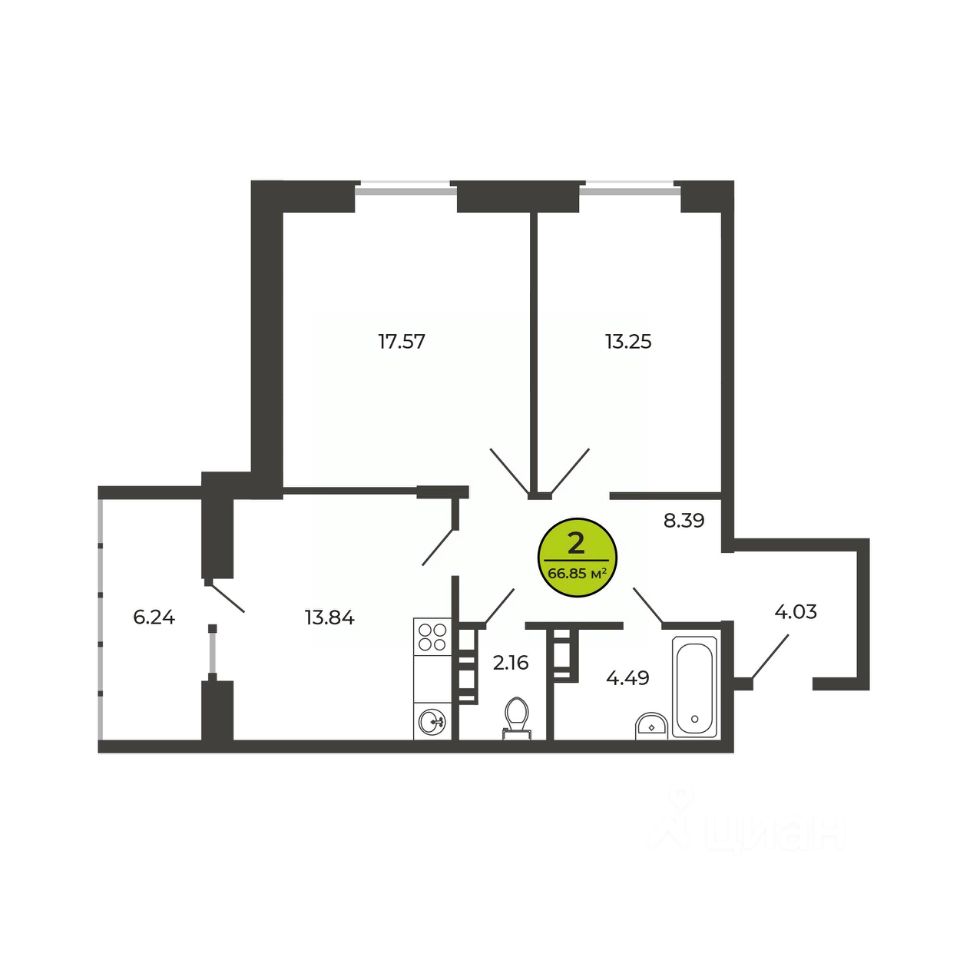 2-комн. квартира, 66,85 м²