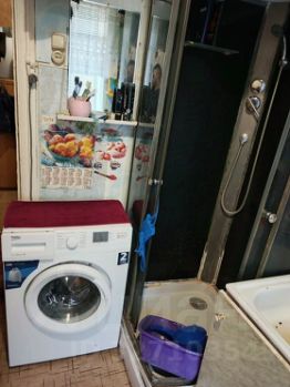 Санузел раздельный. Душевая кабина на кухне, при желании можно сделать перепланировку и совместить.