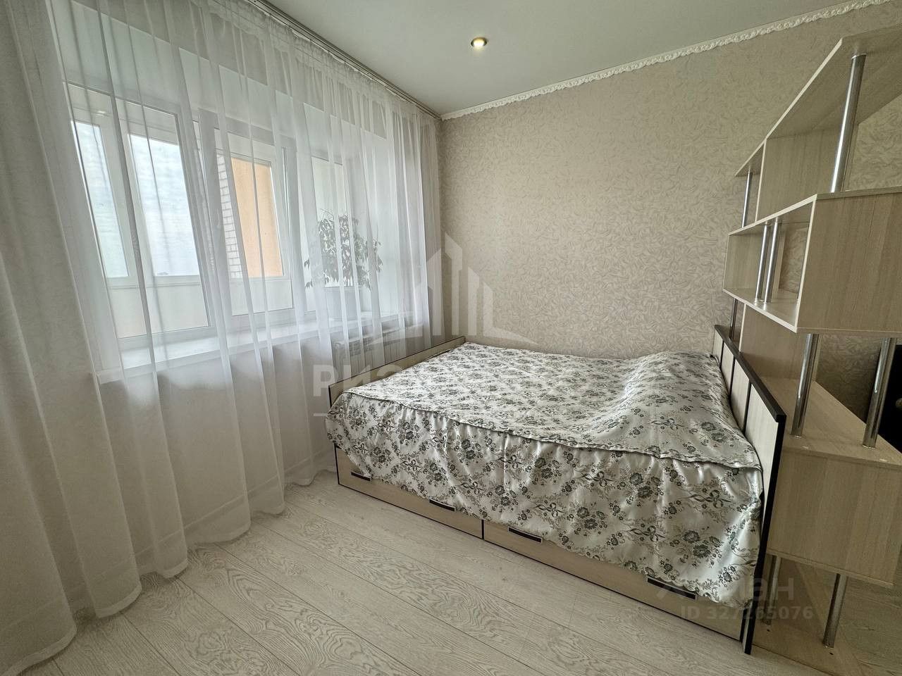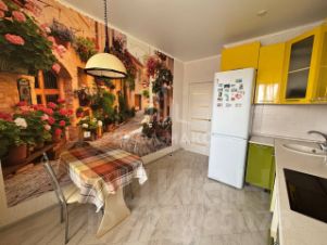 На полу в комнате и в коридоре - ламинат, на кухне - керамогранит. Натяжные потолки с точечным светом. На кухне полы с подогревом.