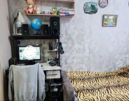 В комнате есть своя кухня. Поменяно окно, поклеены новые обои и натянут потолок. Стоит двойная дверь.