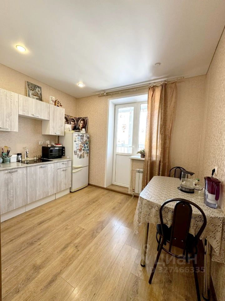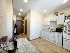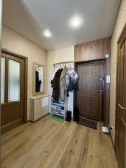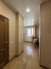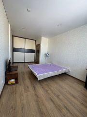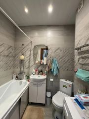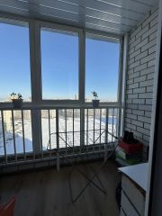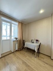 • Выполнен ремонт в светлых тонах. Просторная комната, выход на лоджию из кухни. Потолки 2,7 м. На полу ламинат, в сан. узле плитка. Натяжные потолки. Окна ПВХ, лоджия застеклена. Санузел совместный, в плитке. Установлены счетчики на воду.