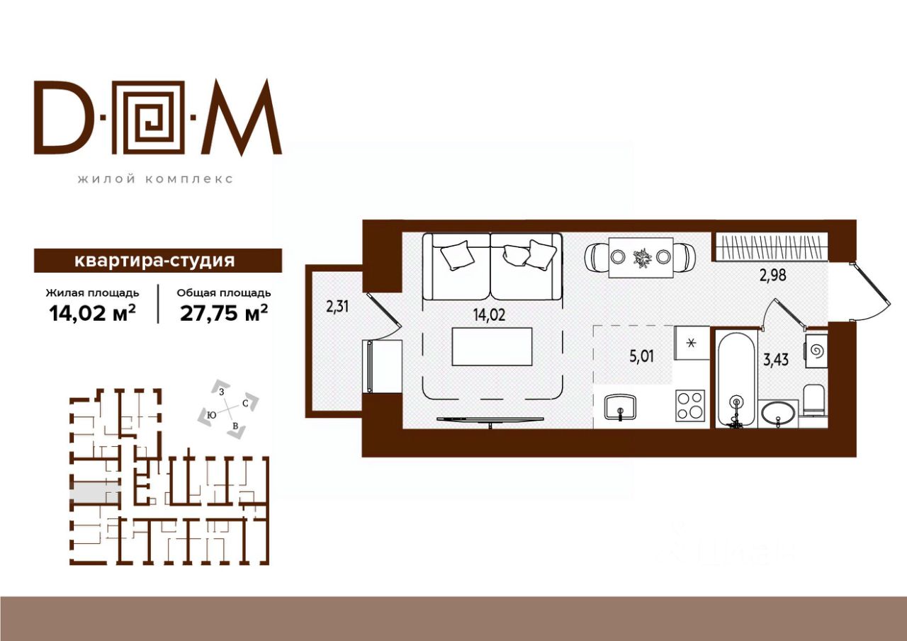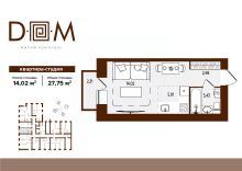 Продаётся студия в строящемся доме (поз.1), срок сдачи: IV-кв. 2027, общей площадью 27.75 кв.м., на 4 этаже. Новый жилой комплекс "Д.О.М." от застройщика "Надежда" расположен по адресу: г. Брянск, ул. Романа Брянского