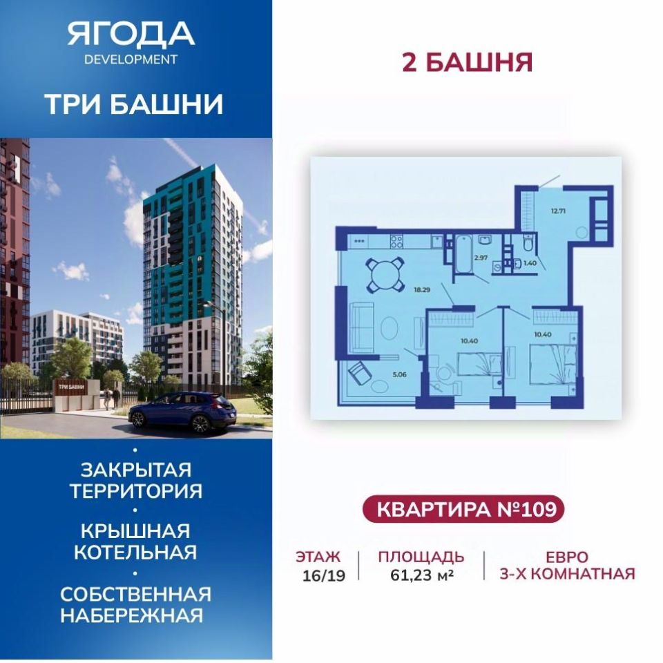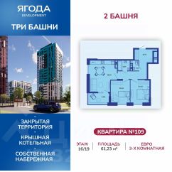 Жилой комплекс "Три башни" расположен у самой воды, на первой линии и является главной архитектурной доминантой района. Месторасположение ЖК является его особым преимуществом: с одной стороны - это современный, динамично развивающийся район с социально-значимой инфраструктурой и удобной транспортной развязкой; с другой стороны - "Три башни" удален от городской суеты и находится в непосредственной близости к природе. В шаговой доступности: остановка общественного транспорта, железнодорожный вокзал, магазины, медицинские кабинеты, салоны красоты, оздоровительные и спортивные заведения, центры дошкольного развития. В непосредственной близости от жилого комплекса расположены жизненно-важные объекты инфраструктуры: супермаркет, пекарня, кофейня, стоматология, зоомагазин, аптека. Компания "Ягода" позаботилась о комфорте своих клиентов. Квартиры имеют усовершенствованную планировку с высокими потолками (2,75 м), большими кухнями-гостиными, отапливаемыми лоджиями. На крыше — собственная котельная. На территории комплекса есть своя детская площадка с современным покрытием, отвечающим всем нормам безопасности. Из окон открывается вид на реку Десна. 3 Башни — комплекс закрытого типа, что гарантирует дополнительную безопасность жильцам и их детям.