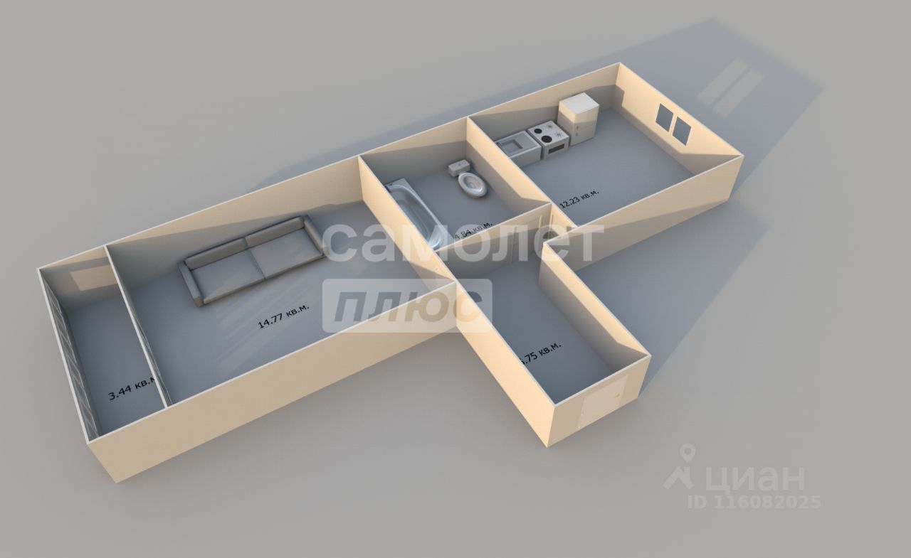Общая площадь: 38.1 кв.м. (без учета лоджии), кухня 12.23 кв.м., комната 14.77 кв.м.