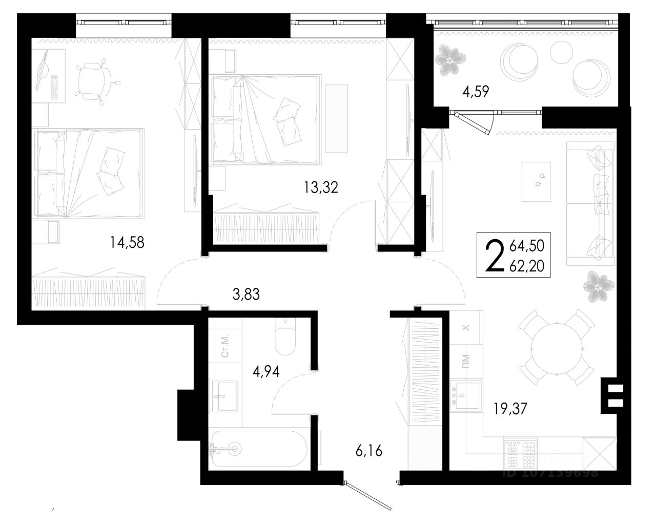 Общая площадь64,5 м²