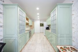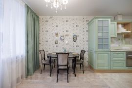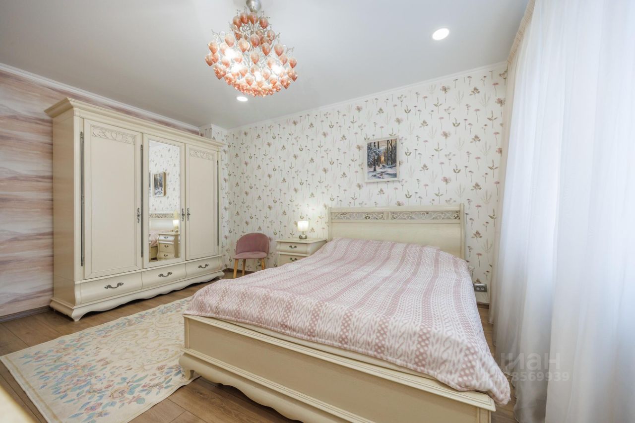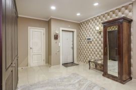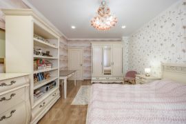 Вся мебель премиального качества, изготовлена из массива дерева: кухня из массива ясеня ("Элегрум" Белоруссия), стол и стулья из массива березы с дубовым шпоном, мебель в спальне, прихожей и гостинной из массива дуба (коллекция "Оскар"), мебель в детской из массива сосны (коллекция " Мальта - Хельсинки"). Люстры Европейского производства (Италия и Германия). Обои и ковёр производства Бельгия.