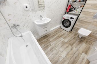 Санузел совмещенный в плитке: Стильный и практичный санузел, полностью готовый к использованию.