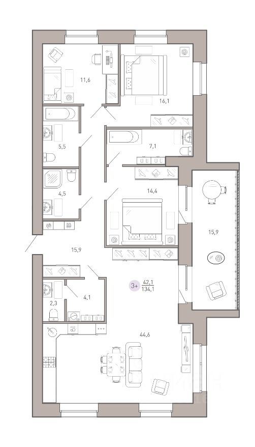 Общая площадь134,1 м²