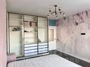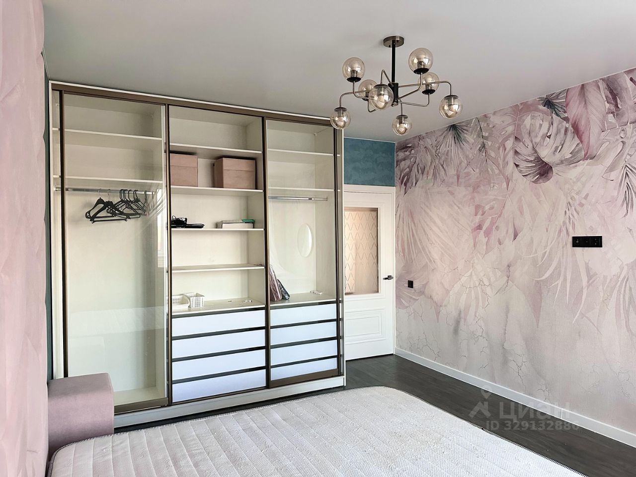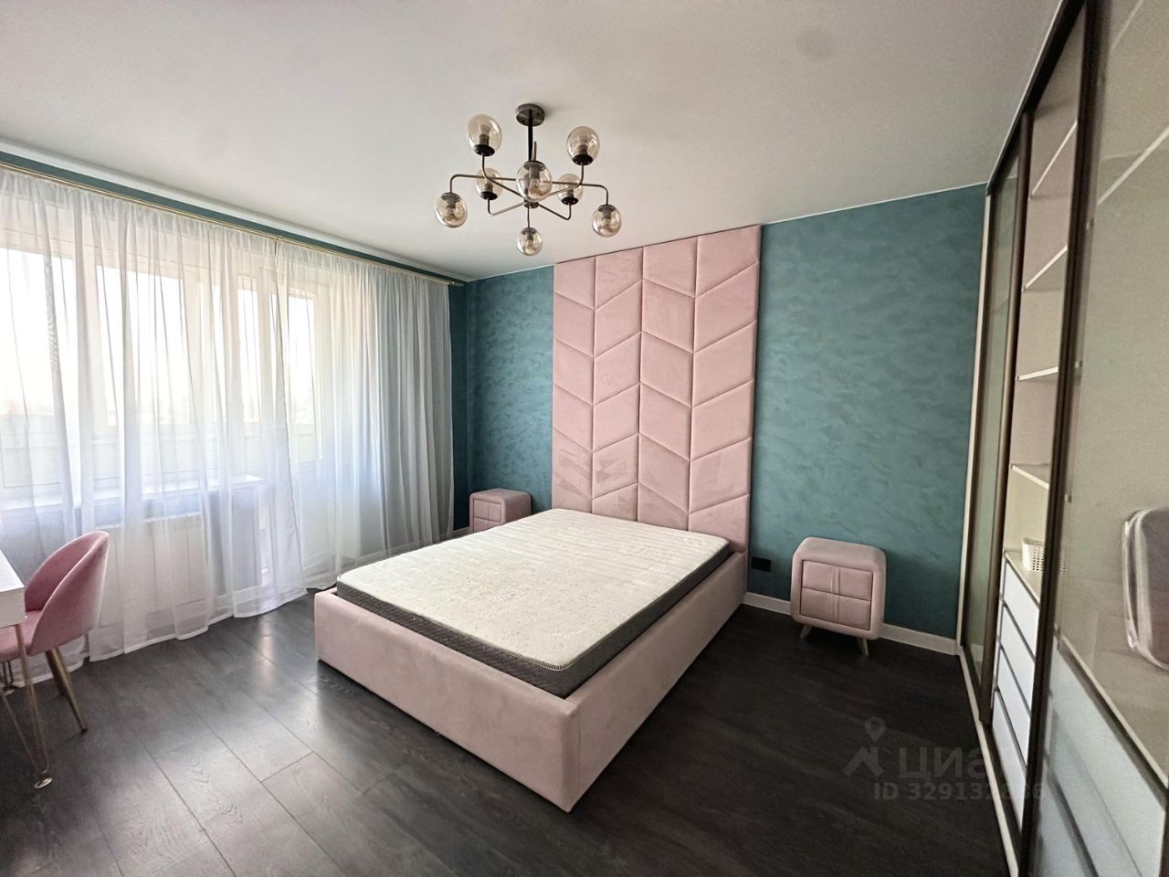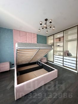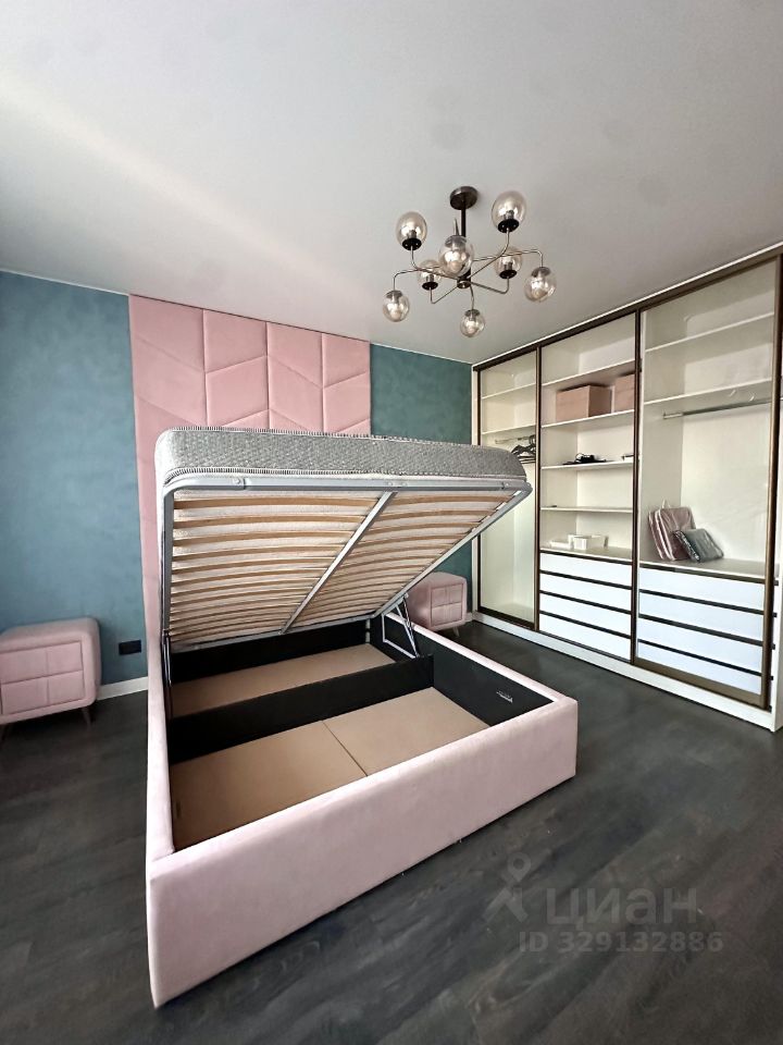 Шкаф-гардеробная, кровать с мягким изголовьем до потолка и подьемным механизмом. Туалетный столик и зеркало.