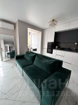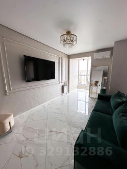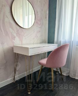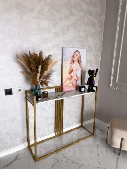 Бархатный раскладной диван,зеркало в золотой алюминиевой раме. Консоль. Отдельная столовая зона с панорамным видом. Трековые светильники.